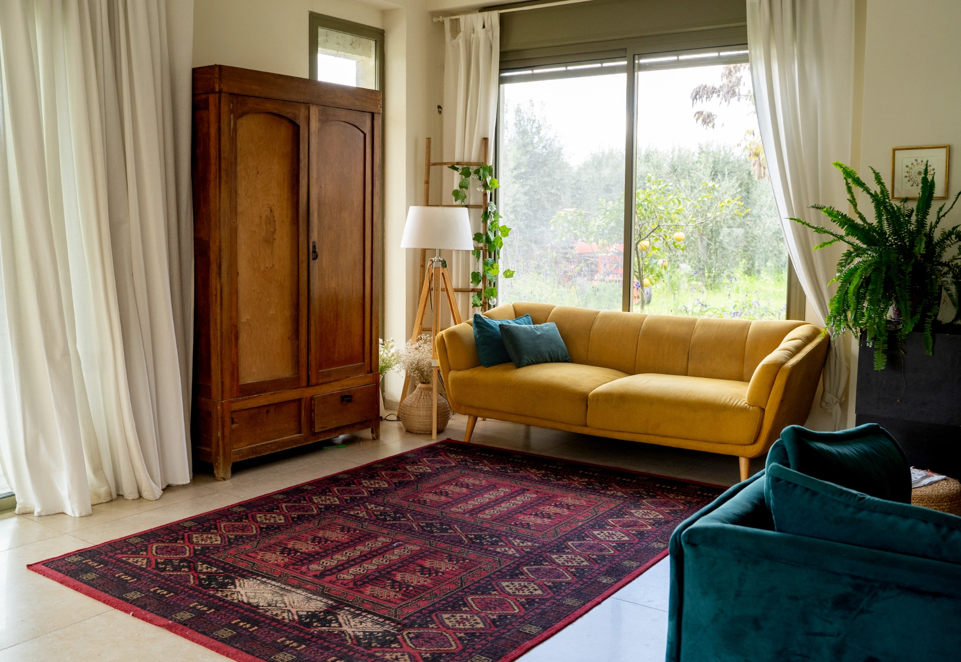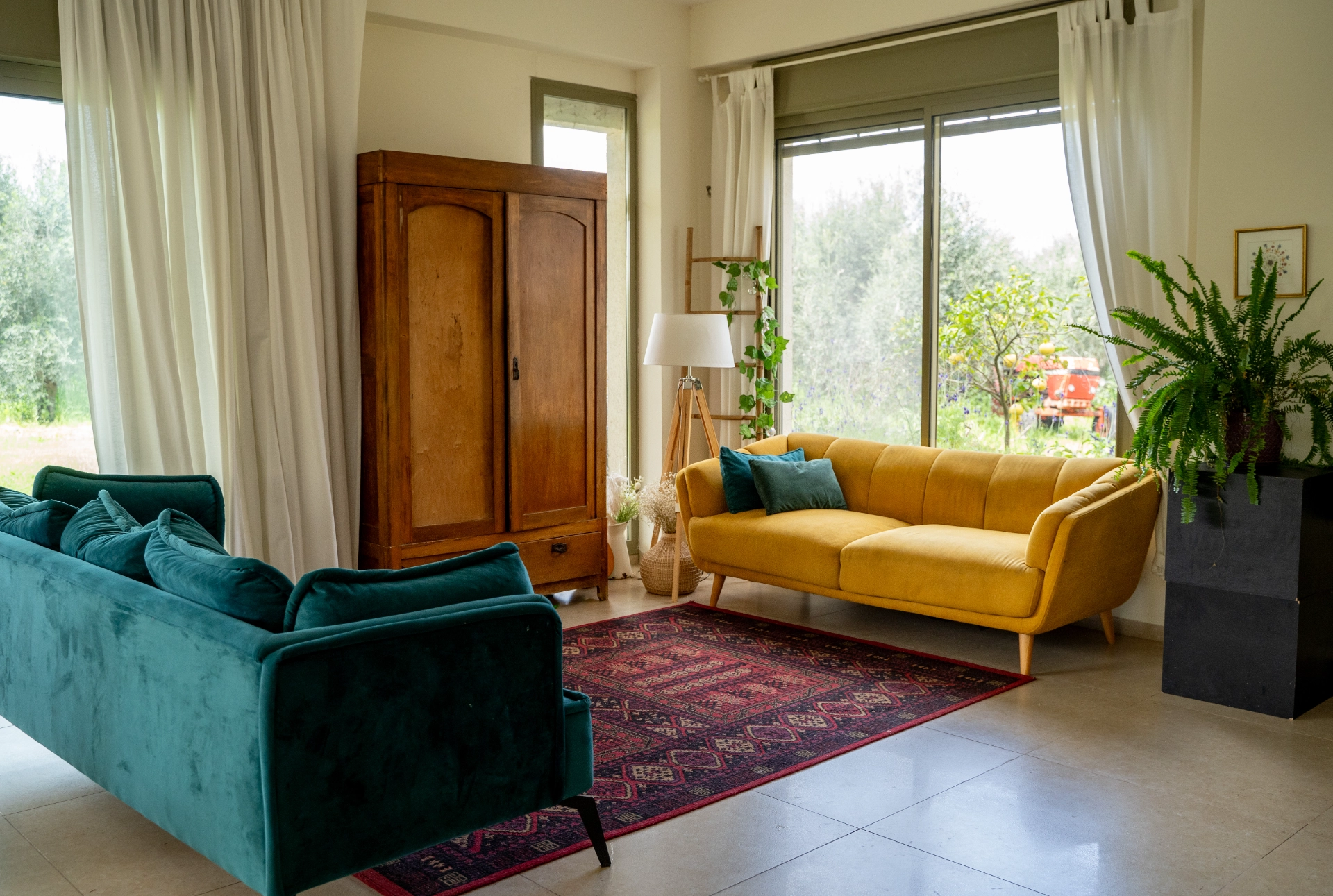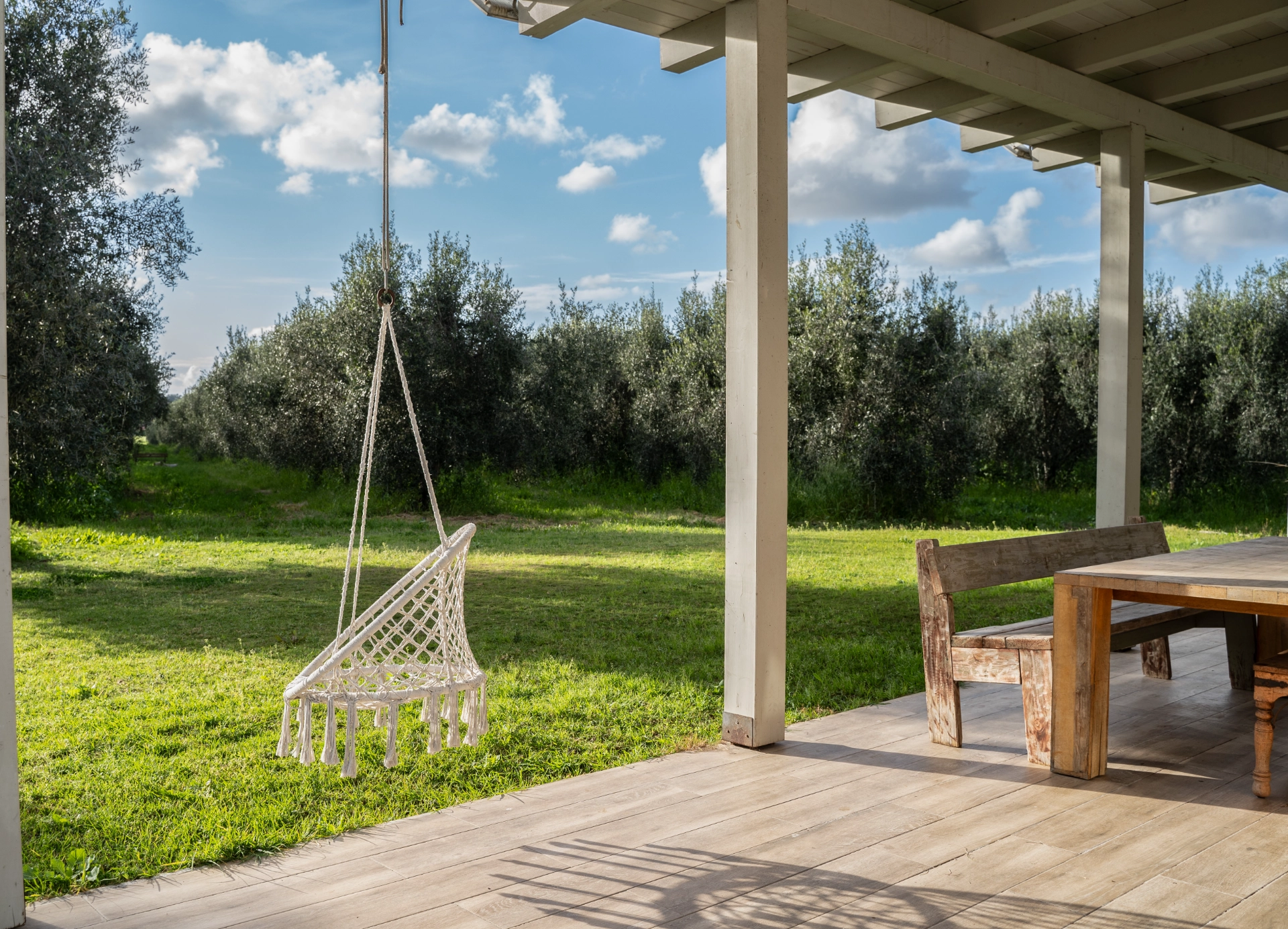 פינות מעוצבות שנמצאות בתוך חלל הבית ונוף משגע של מטע זיתים.